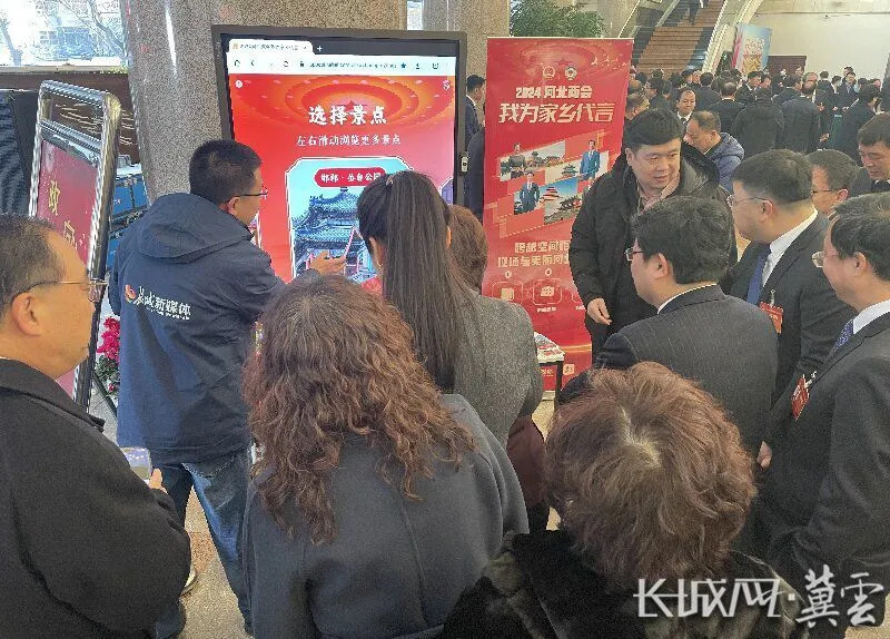 长城新媒体两会直播间互动体验区推出互动作品《2024河北两会 我为家乡代言》,图为代表委员们驻足体验。长城网·冀云客户端记者 林翔 摄