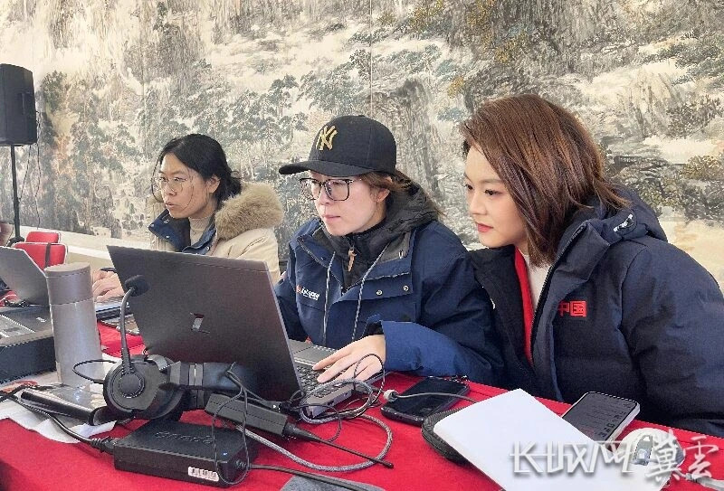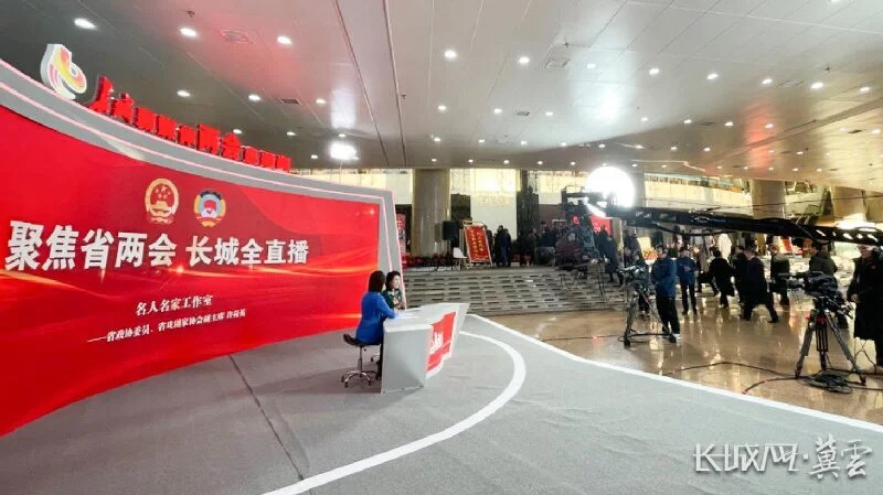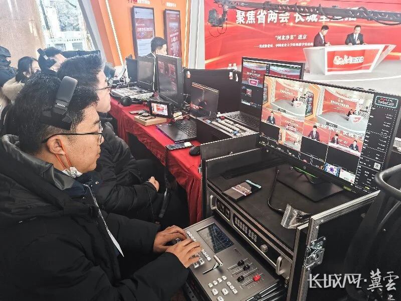 长城新媒体两会直播间搭建于河北会堂一楼大厅,图为《聚焦省两会 长城全直播》正在直播。长城网·冀云客户端记者 林翔 冯硕 摄
